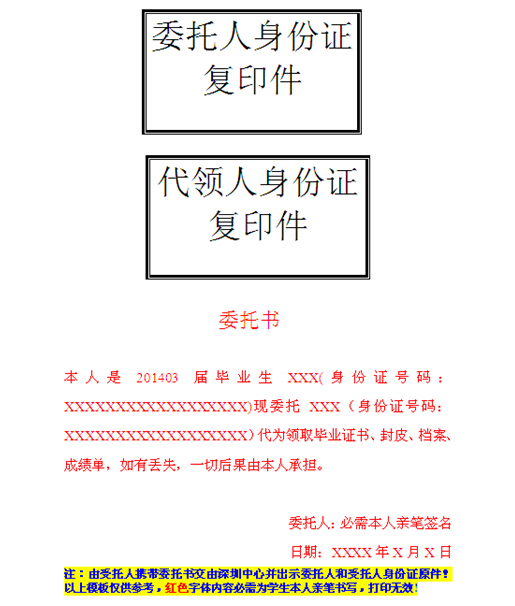 《委托書》詳見以下模板,僅供參考,紅色字體內(nèi)容必須畢業(yè)生本人親筆書寫,打印無效?。?!