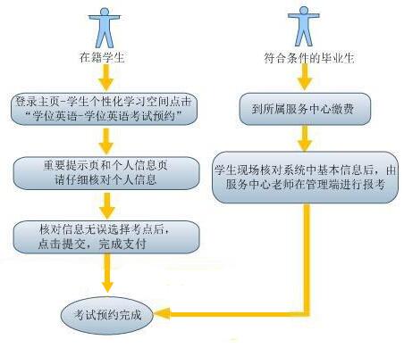 在籍學(xué)生需要在個(gè)性化學(xué)習(xí)空間中自行預(yù)約考試并交費(fèi);畢業(yè)后兩年內(nèi)的本科層次學(xué)生若除學(xué)位英語(yǔ)外,其它條件都符合申請(qǐng)學(xué)士學(xué)位的條件,可由所屬服務(wù)中心代為預(yù)約,考試費(fèi)用需要交到服務(wù)中心。