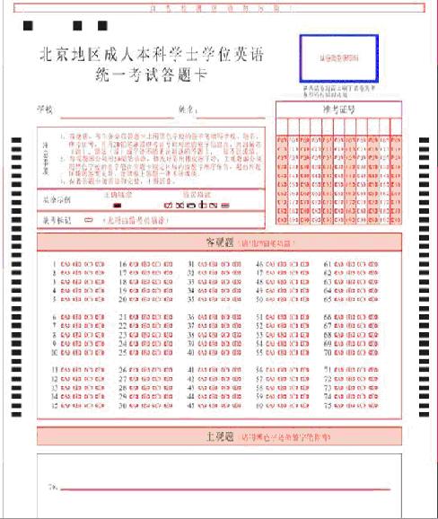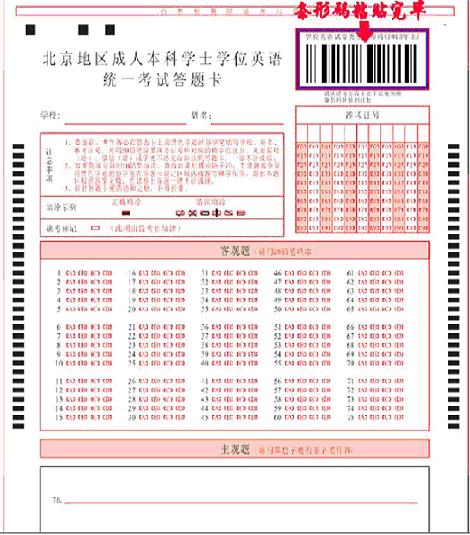 從08年4月開始北京地區(qū)成人本科學士學位英語統(tǒng)一考試實行網(wǎng)上閱卷,且從2013年5月開始學位英語考試開始實施“一題多卷”,即考試試題相同,題目順序被打亂,使用相同的答題卡,以試卷上的條形碼為區(qū)分。 (考生拿到試卷和答題卡后,請從試卷封面取下試卷類型條形碼,粘貼到答題卡指定位置。)新的試卷樣式見所附圖片:北京地區(qū)成人本科學士學位英語統(tǒng)一考試試卷(樣式)。