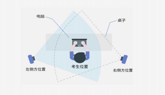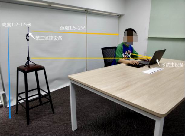 2.統(tǒng)考雙機(jī)位考試需配備一部智能手機(jī)微信掃碼運(yùn)行鷹眼程序監(jiān)控考試過(guò)程,建議使用三腳架固定手機(jī),監(jiān)控手機(jī)擺放于考生側(cè)后方45度角左右位置,距離考生1.5-2米左右,確保能完全拍攝考生、電腦及桌面。